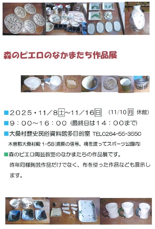 内容 | 資料館企画展2025【森のピエロのなかまたち作品展】を開催します! 陶芸作品だけでなく布を使った作品も展示します。 |