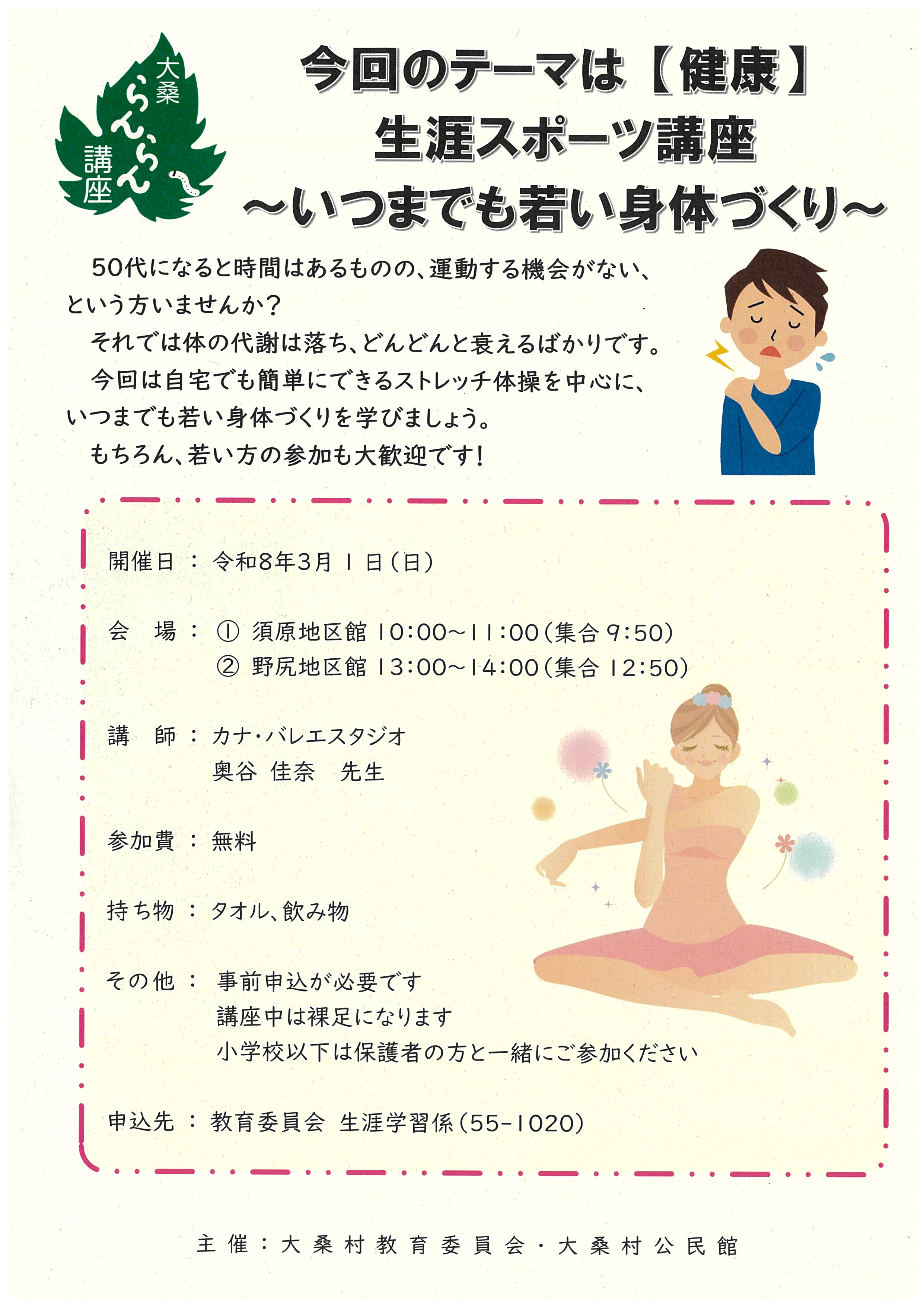 大桑らんらん講座【健康】生涯スポーツ講座 ~いつまでも若い身体づくり~ を開催します。